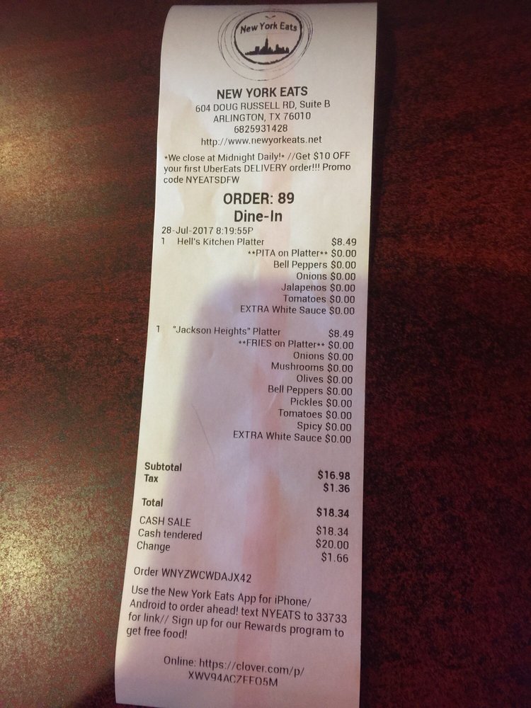 Introducing New York Eats, a casual dining spot in Arlington, TX, offering a variety of street cart platters, pita wraps, and mouthwatering burgers. From the Manhattan Mix Plate to the Times Square Burger, the menu is packed with options for all tastes. Customers rave about the fast delivery and consistent quality. While some have mixed feelings about certain dishes, the overall consensus is positive, with many praising the authentic flavors and generous portions. If you're craving New York-style halal street cart food at an affordable price, New York Eats is the place to go. Don't miss out on the flavorful gyro wraps, chicken platters, and unique burger offerings. Experience a taste of the Big Apple in the heart of Texas at New York Eats.